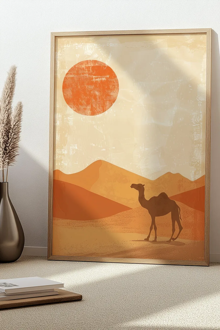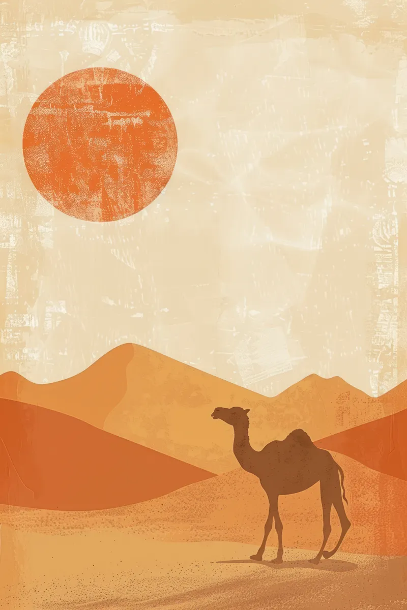 Full shot of a desert scene with a stylized orange sun and a solitary camel in a minimalist style.