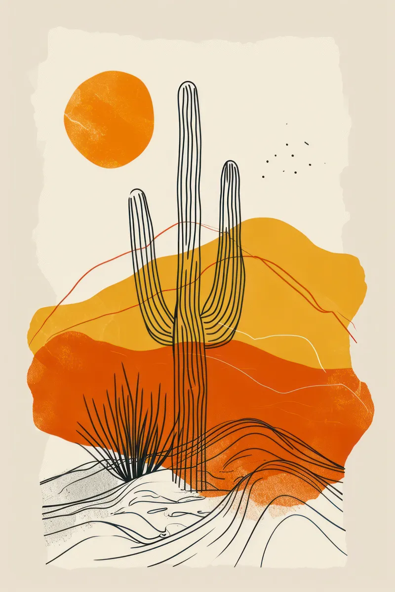 Stylized Saguaro Cactus Desert Landscape Artwork