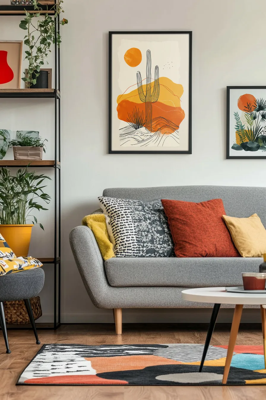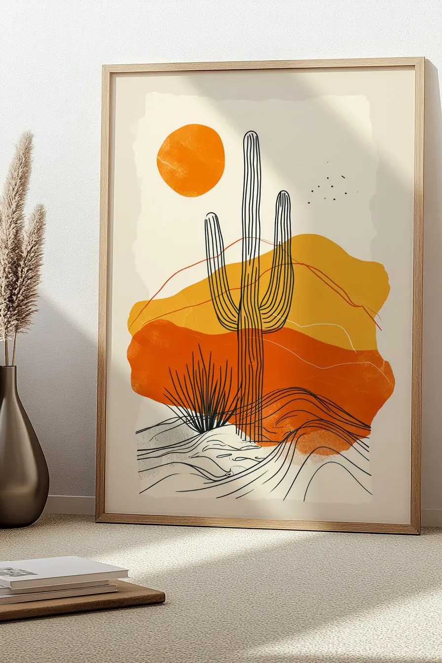 Explore a vibrant desert scene with a stylized saguaro cactus and abstract landscape in this unique artwork.